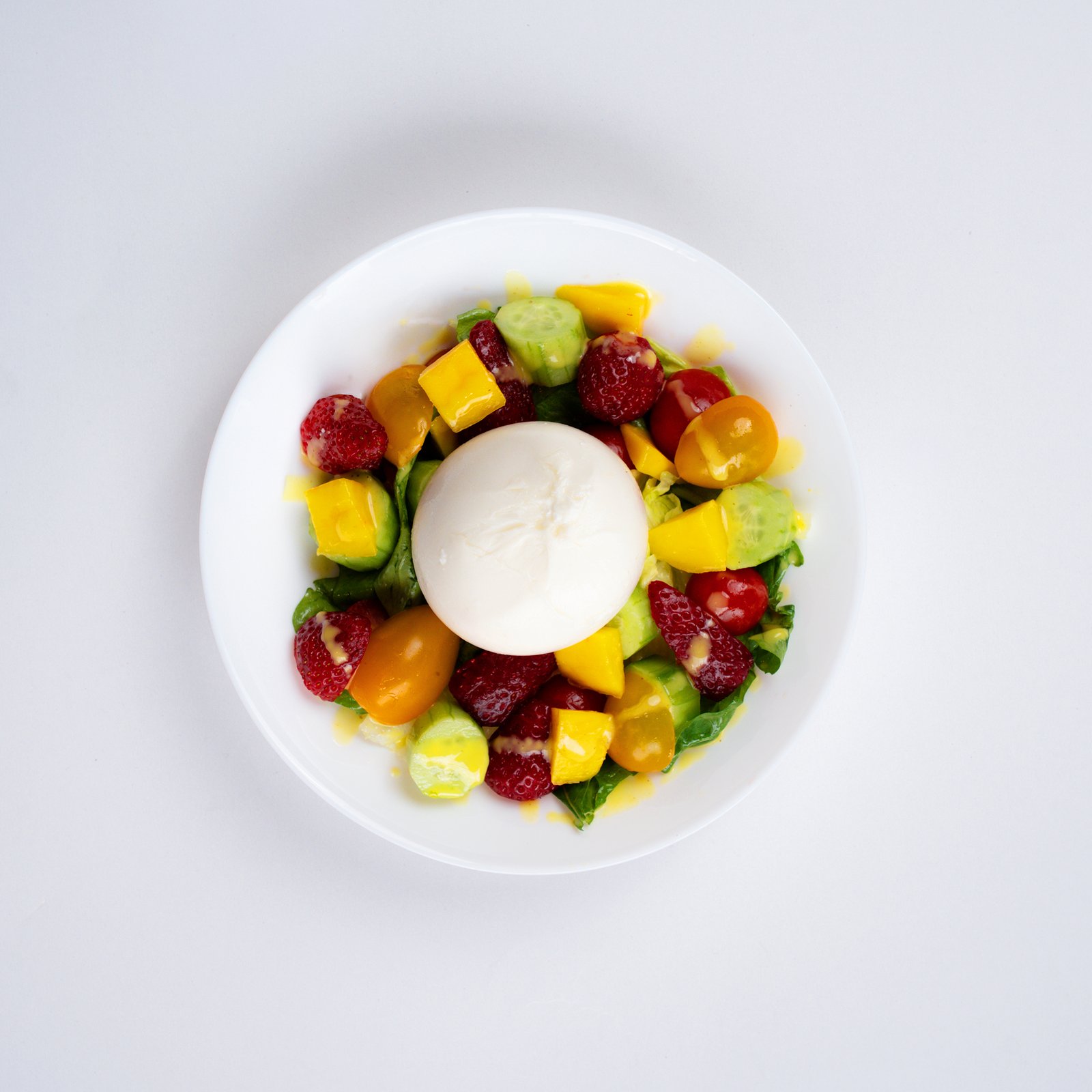Iceberg lettuce, arugula, cucumbers, cherry tomatoes, seasonal fruits, Burrata cheese, drizzled with our special vinaigrette dressing.