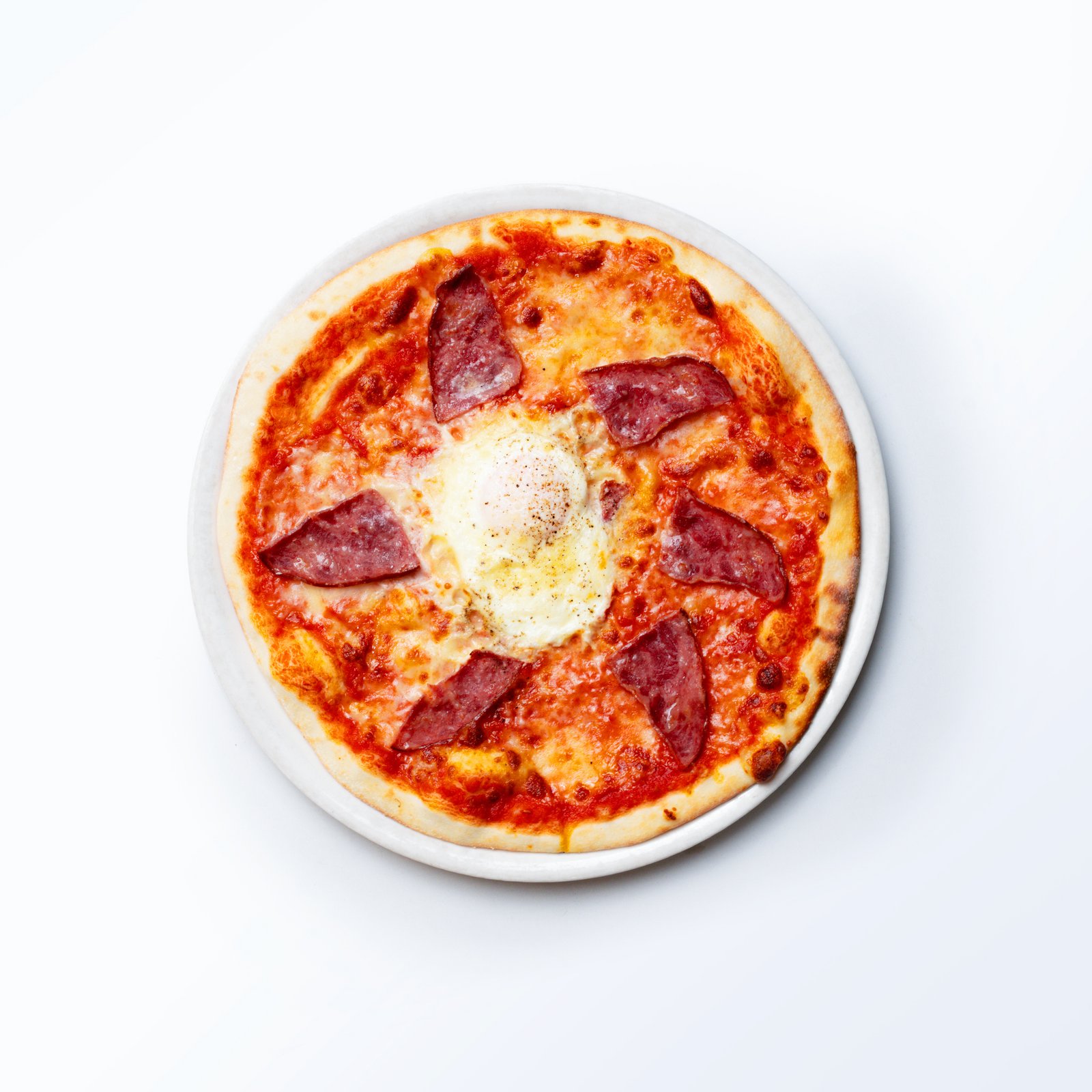Tomato sauce with Mozzarella cheese topped with slices of Beef Bacon & Sunnyside up Egg with a pinch of Parmesan cheese & finished with fresh Ground Black Pepper.