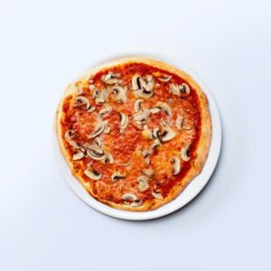 Tomato sauce with mozzarella cheese topped with fresh mushrooms.