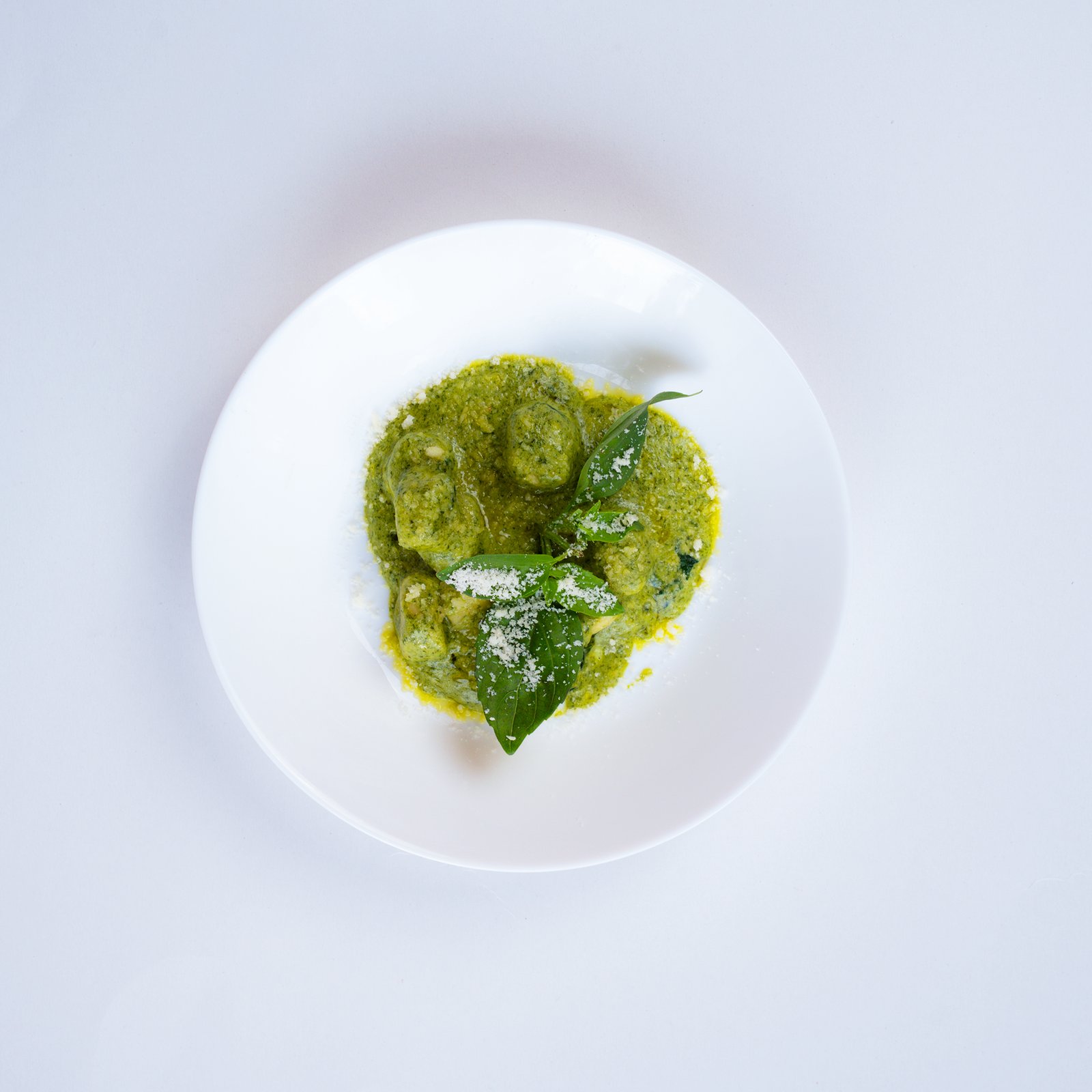 Soft handmade potato gnocchi tossed in fresh basil pesto sauce and fresh cream.