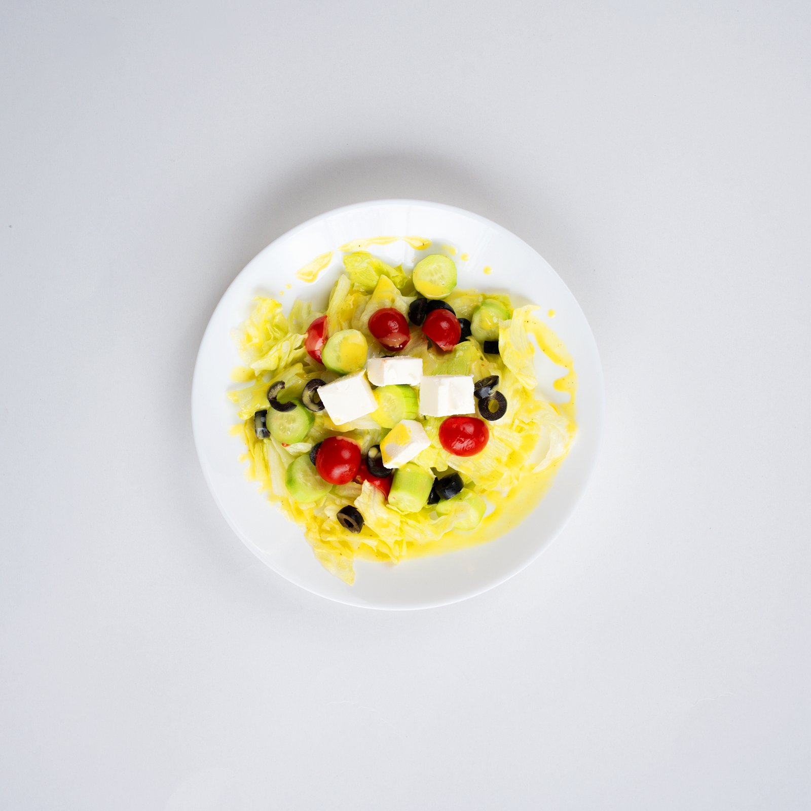 Iceberg lettuce, arugula, seasonal fruits, crunchy cucumbers, cherry tomatoes