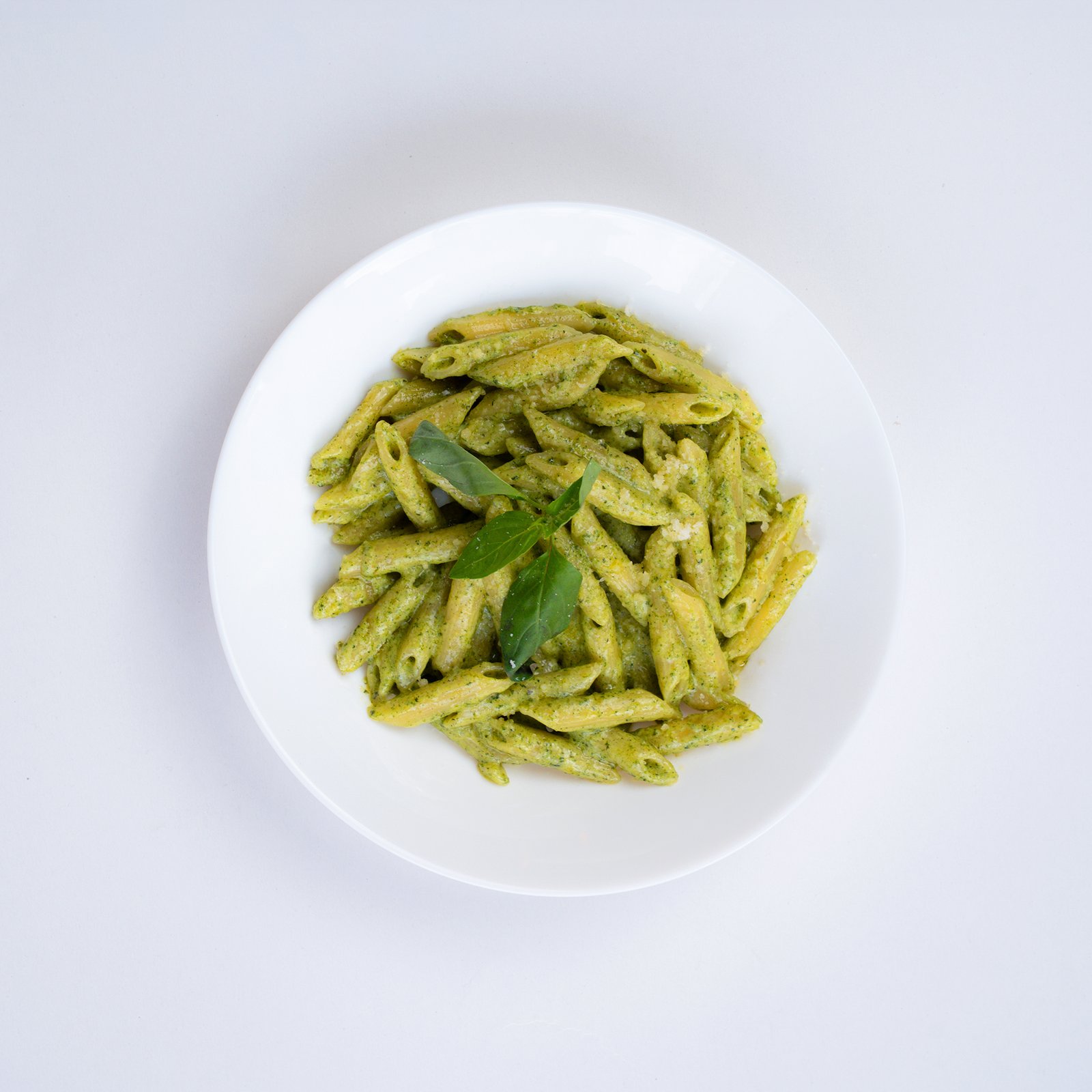 penne in a creamy yet rich home-made pesto sauce topped with parmesan cheese