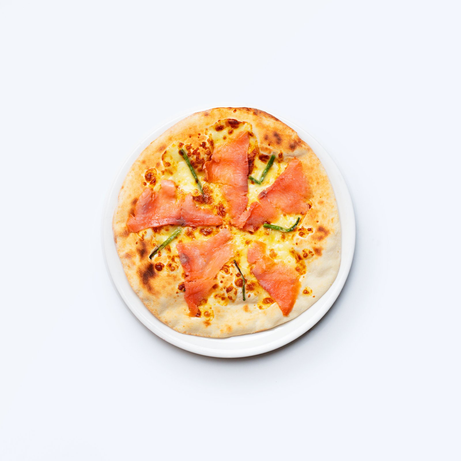 Mozzarella cheese topped with chunks of Premium Smoked Salmon and Asparagus
