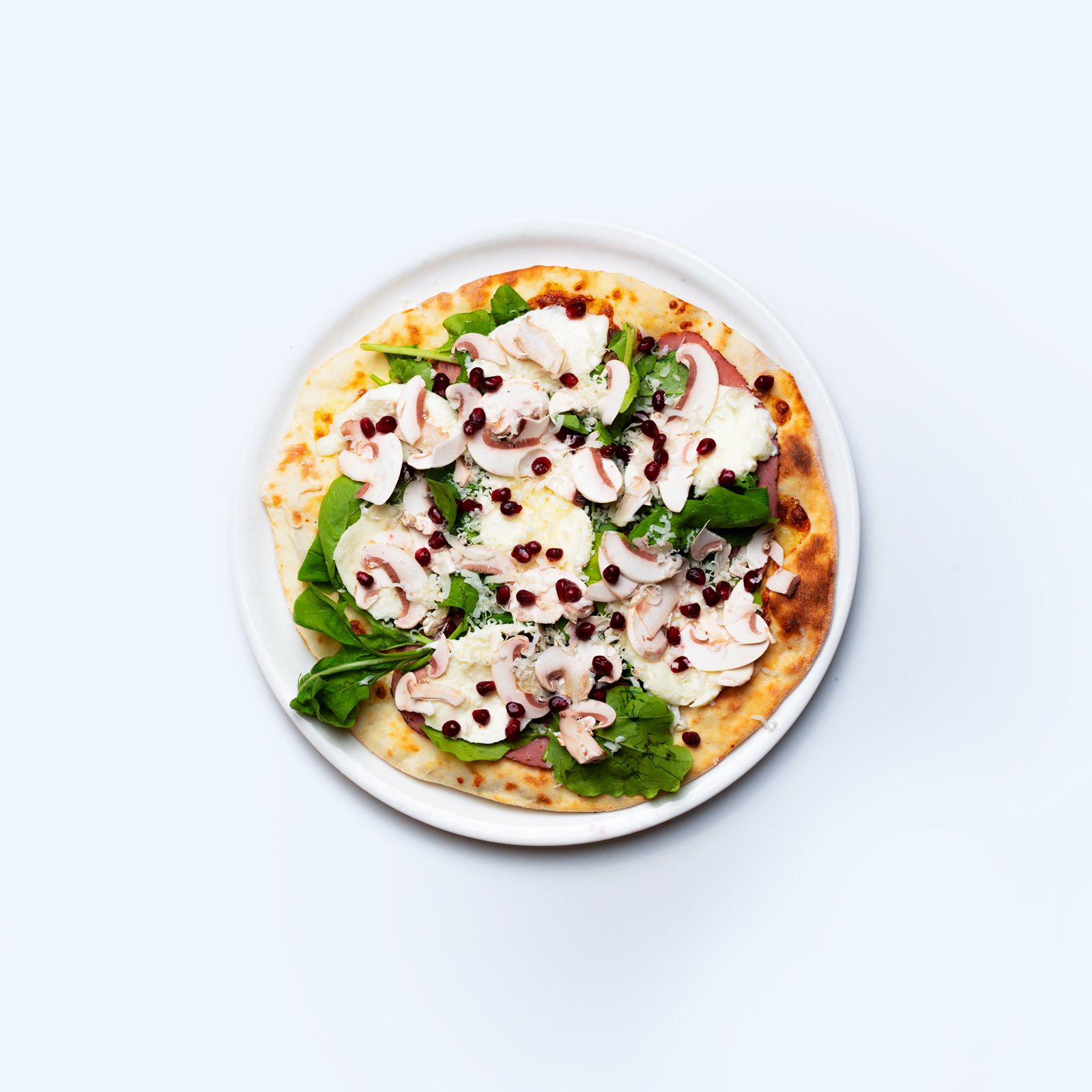 Roasted beef, cherry tomatoes, rocca, fresh mushrooms, fresh mozzarella with parmesan and pomegranate.