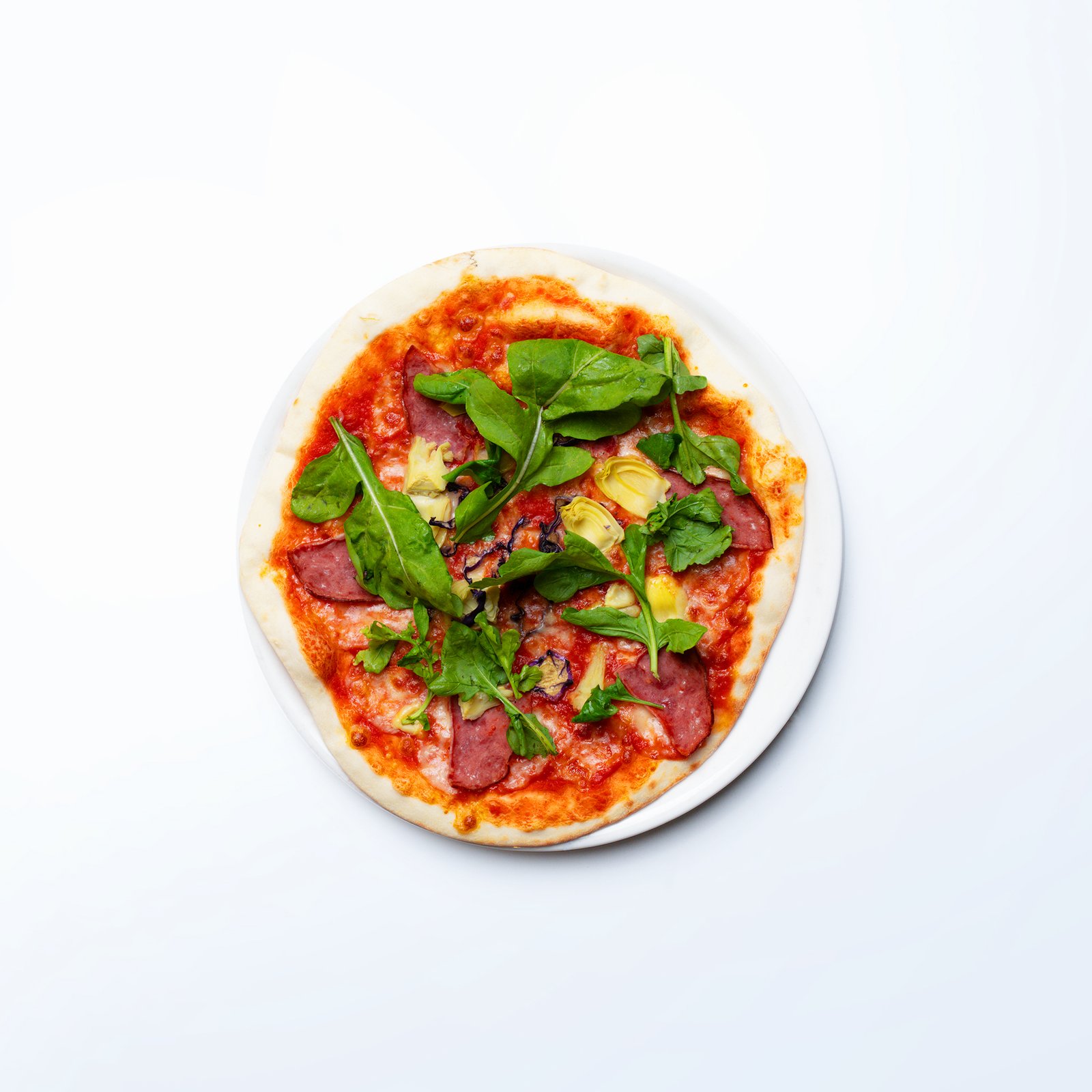 Tomato sauce, mozzarella cheese, beef bacon, artichokes, red cabbage, arugula, garnished with shaved parmesan.